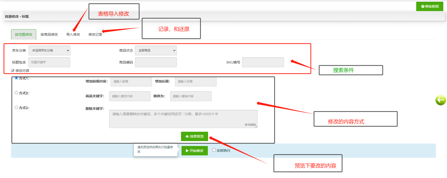 一,批量修改 红框 部分所有修改的搜索条件 其它 修改一样,只是修改的内容不同。
