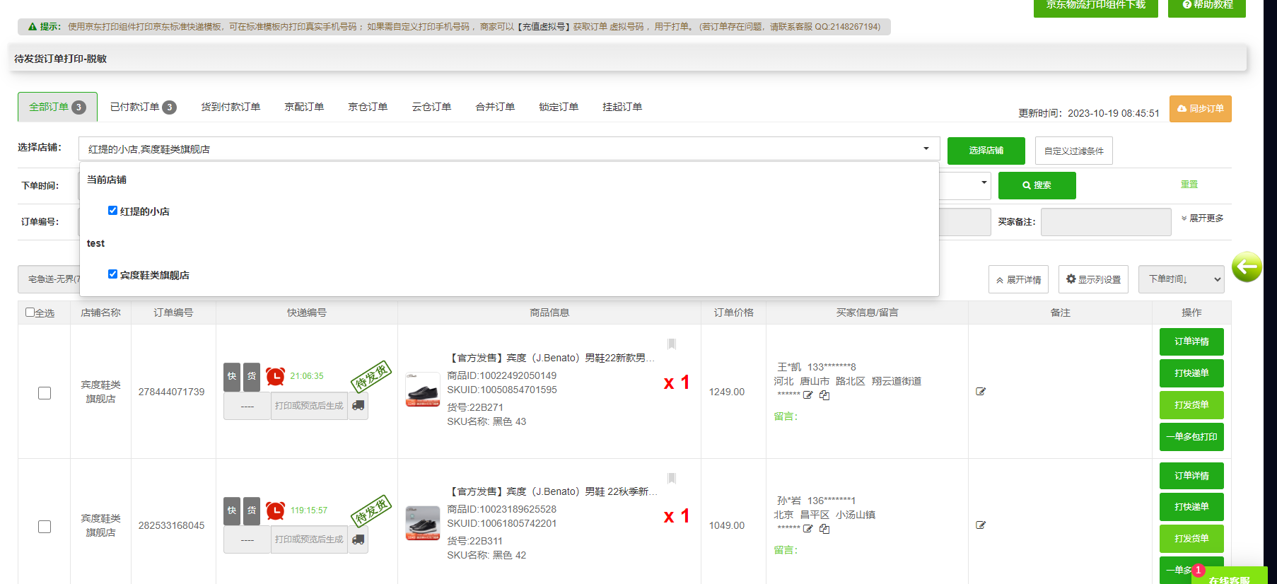 一,经过 上面的多店绑定 和分享 可实现 共享 面单 打印 和切换多店铺 右上角或对应功能处 可选择店铺的 不同的店铺的 店铺订单 进行打印 。