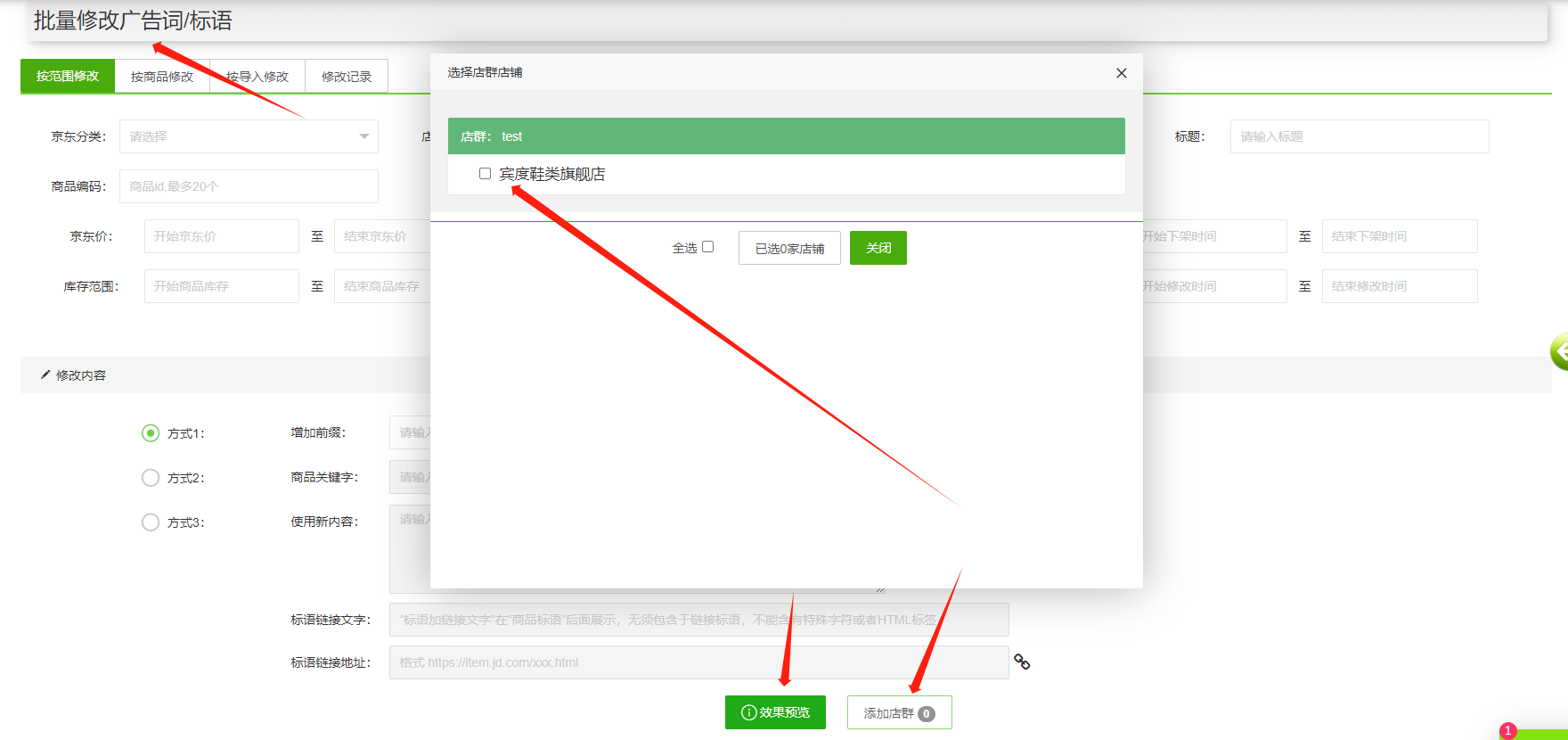 四,批量修改 可支持店铺的 不同店铺修改选择