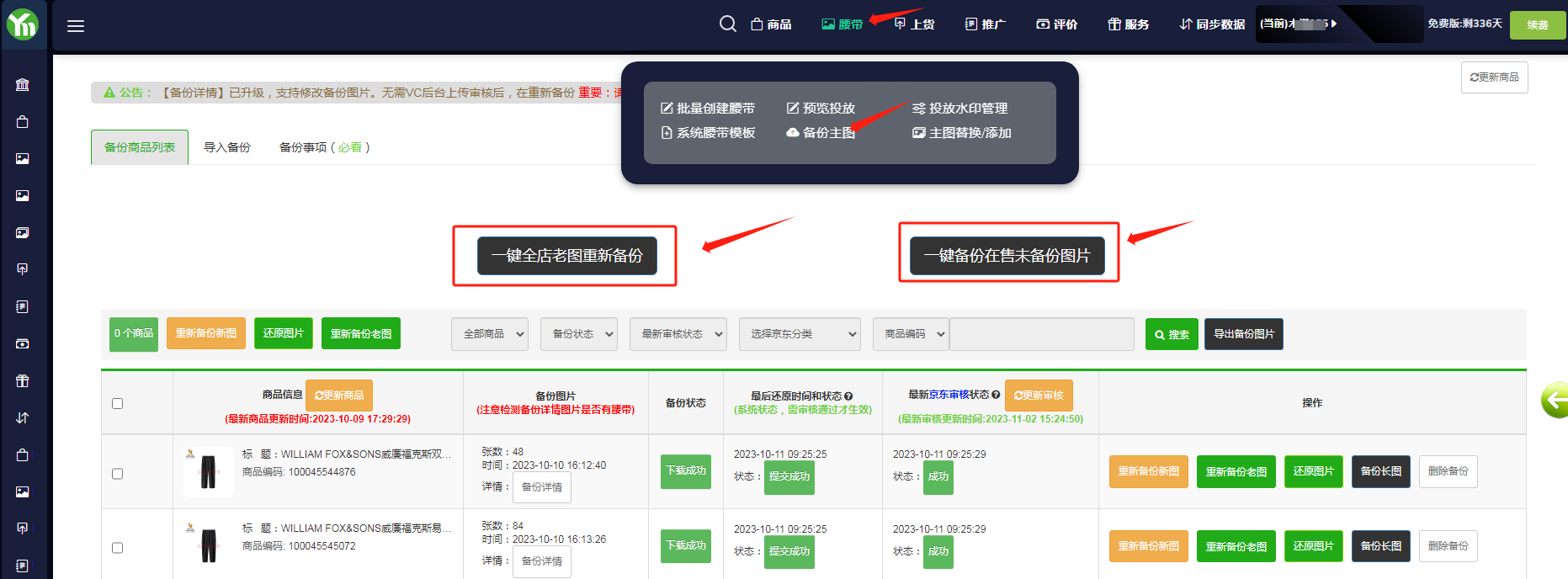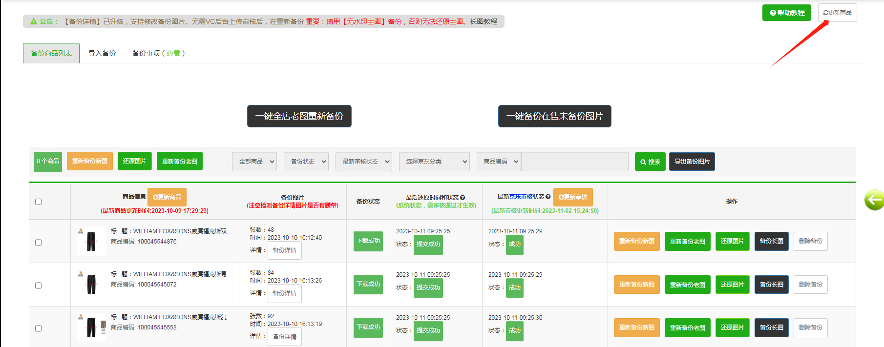 商品有新发布的或者重新上架商品,都需要点击备份主图里的【更新全部商品】选项