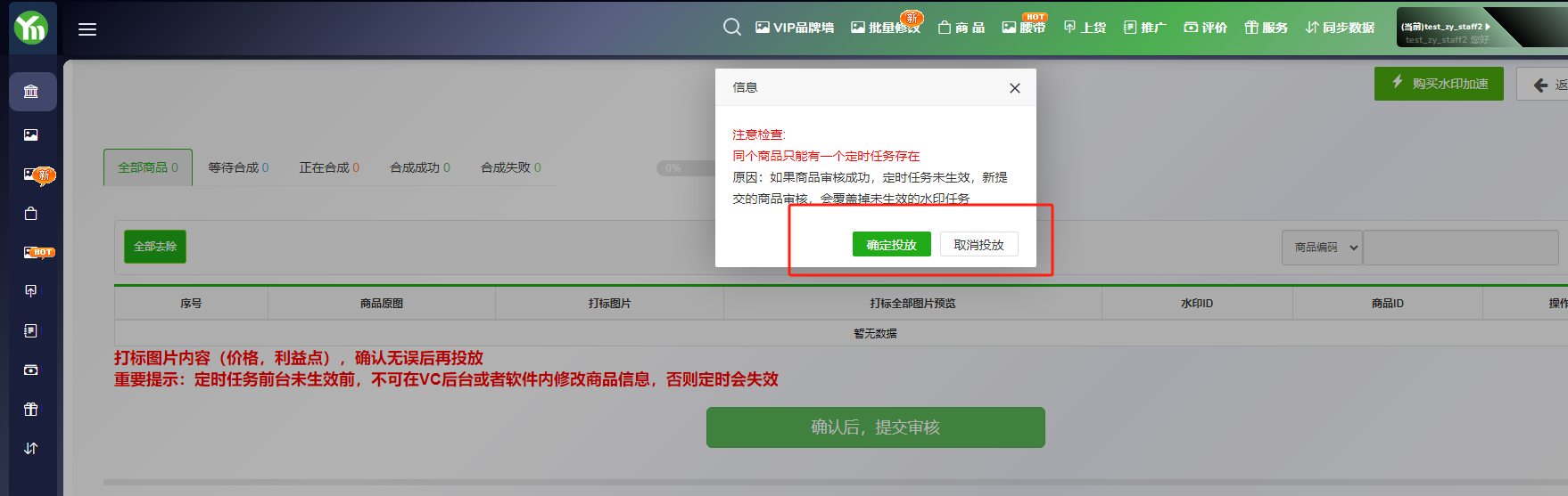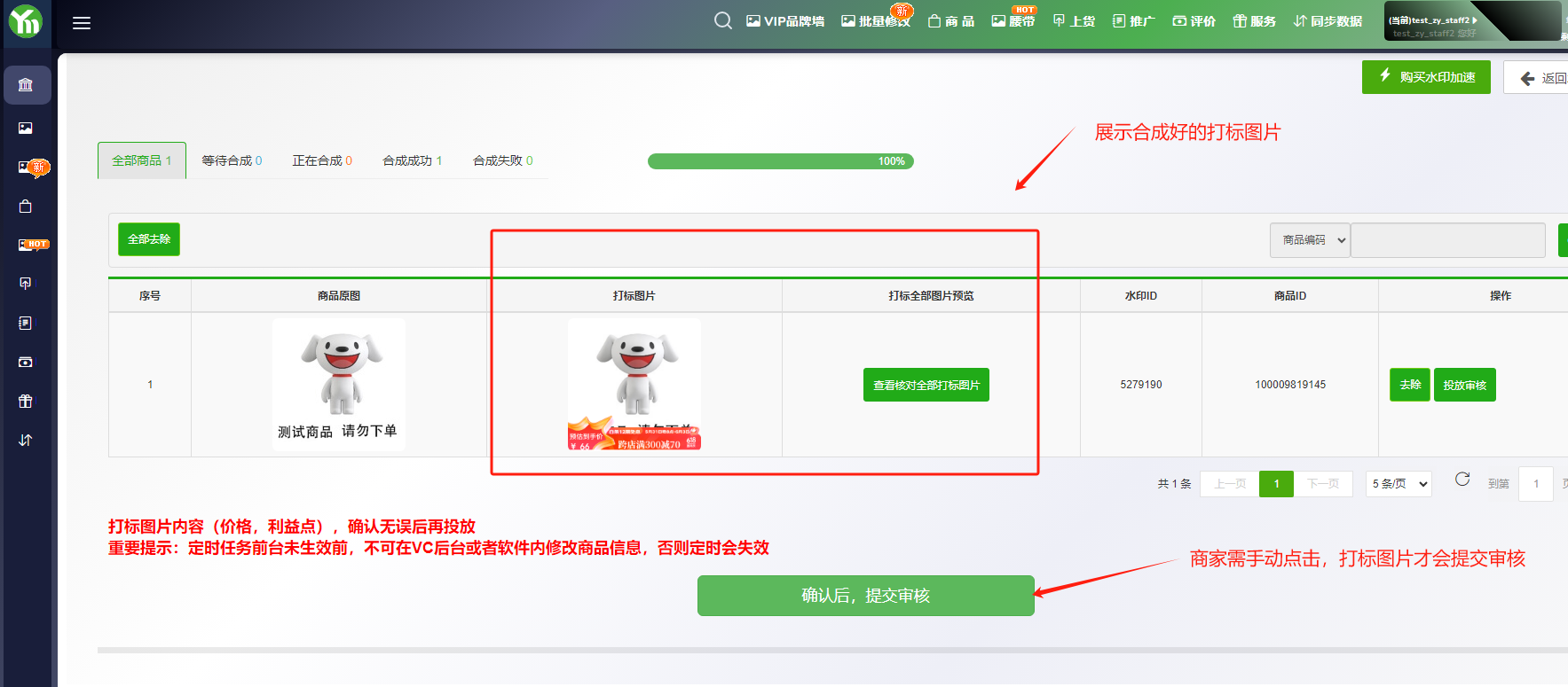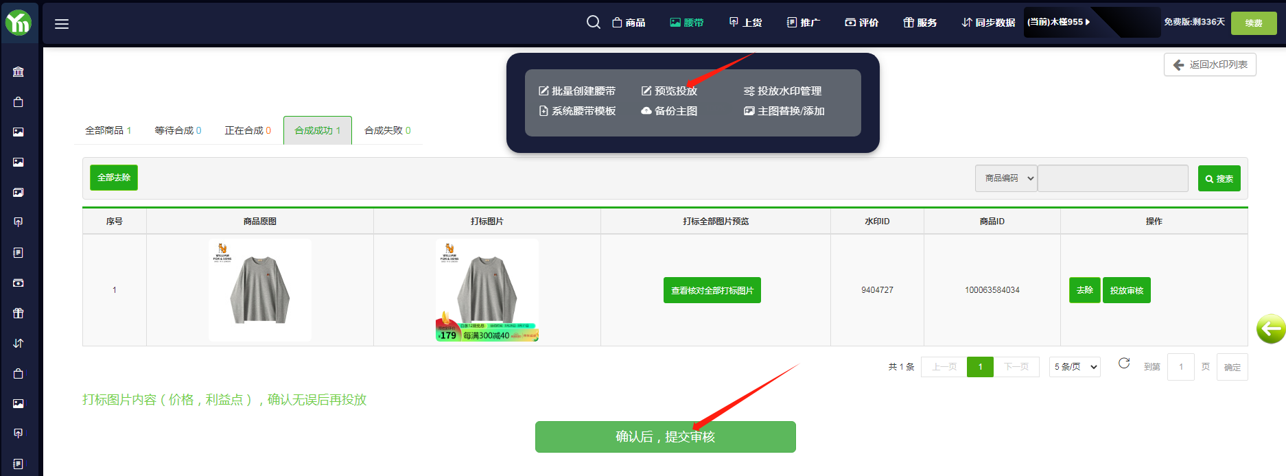 预览投放的合成里,可以看到提交合成预览的商品水印图片,商品合成水印和退出水印都是根据商品备份的图片去操作的,合成成功可以看到备份的原图和合成的效果图。确认无误就点击提交审核。