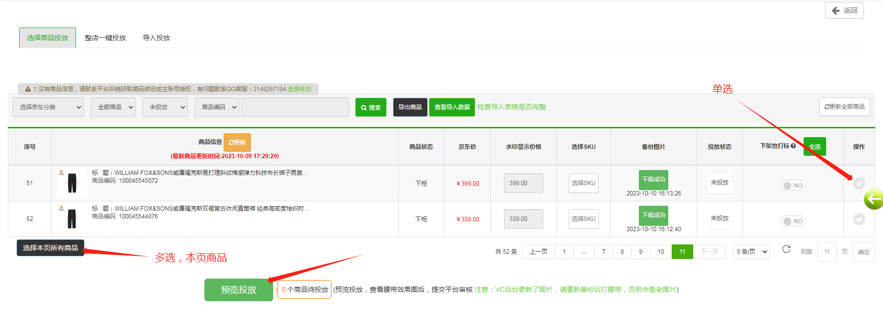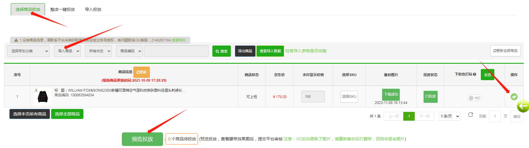 查看商品投放后商品审核状态,审核状态显示成功,就会在页面显示,如果设置定时投放,在投放详情商品页面会显示定时投放的时间。退出水印也是投放详情页里操作的。图片黄色选项里是更新商品审核状态。