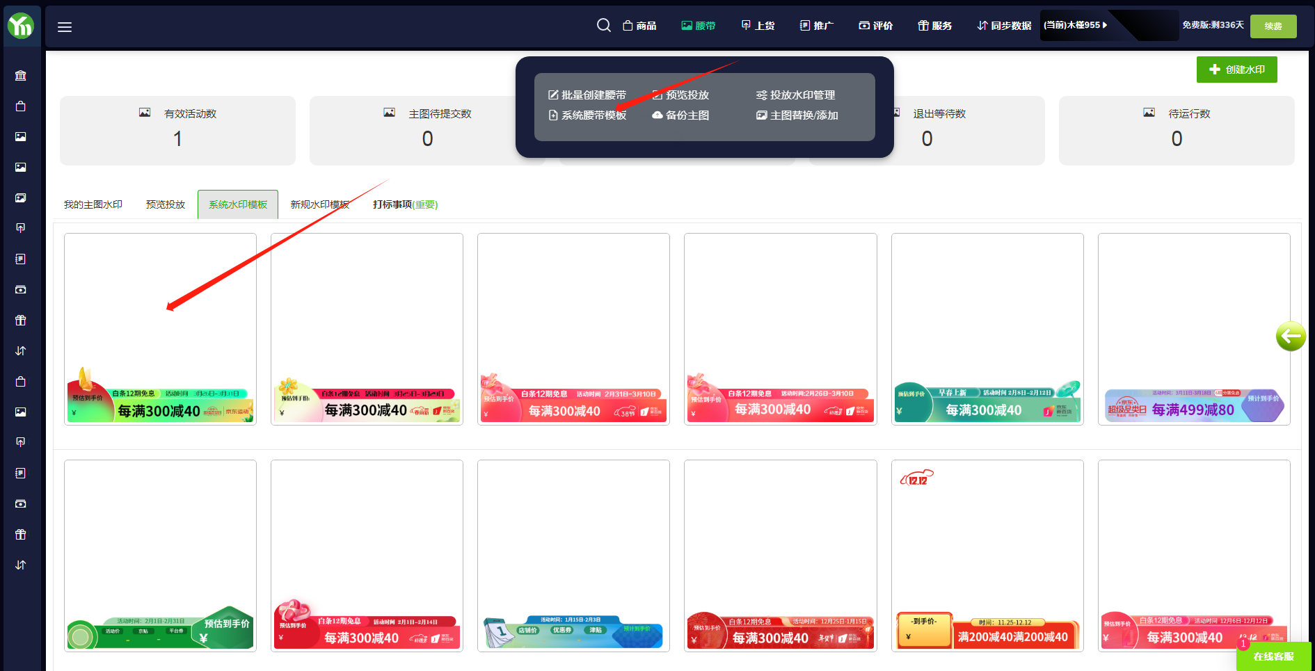 备份主图商品备份完成后,就可以点击创建水印任务,可以使用系统模板或者是本地上传的水印模版,或者平台提供的水印模板。