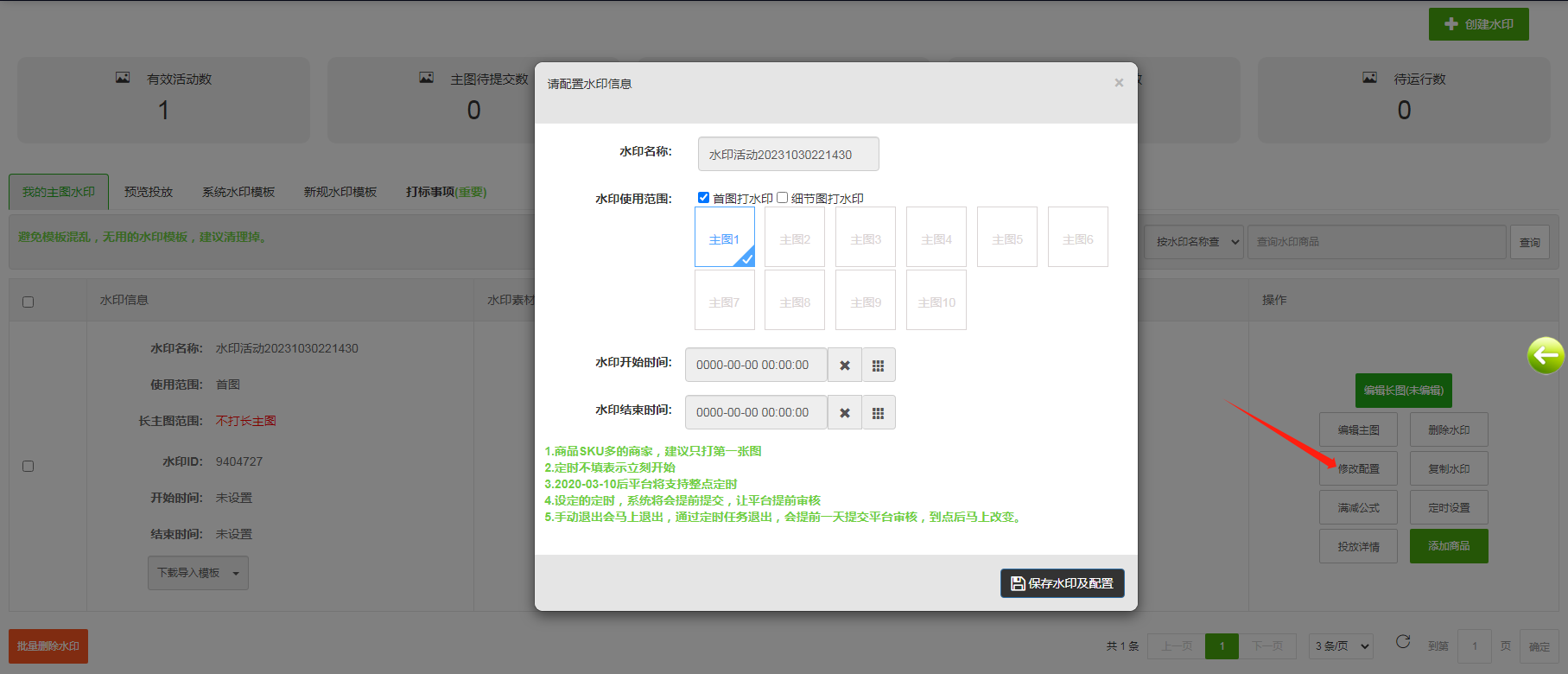 修改配置,正常是用于修改水印任务定时退出时间,自营店退出商品也是需要审核,为了避免跟打标的商品时间重叠,系统设置退出时间设置必须大于20个小时以上.