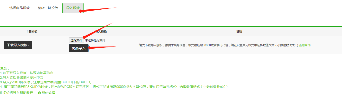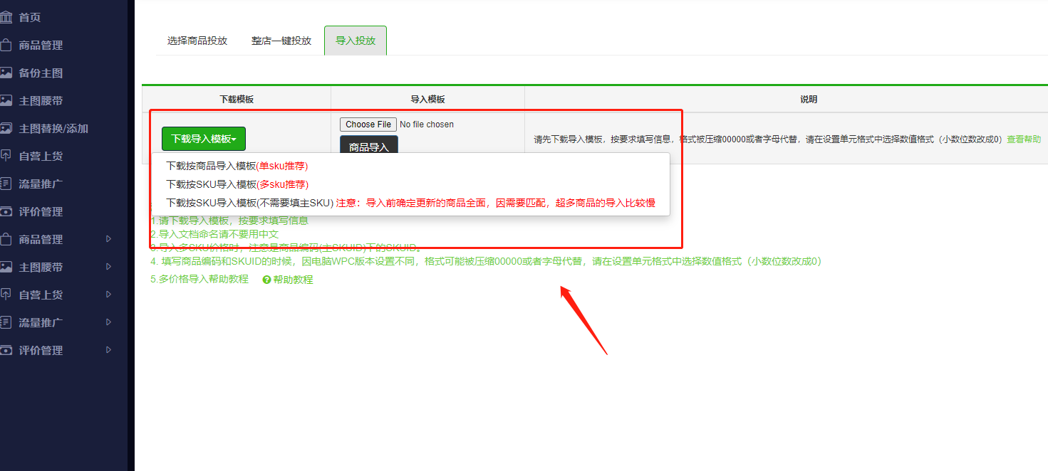 下载按SKU导入模版,这个模版是需要填写主SKU和子SKU,适合打SKU不同价格的商品,如下图介绍。