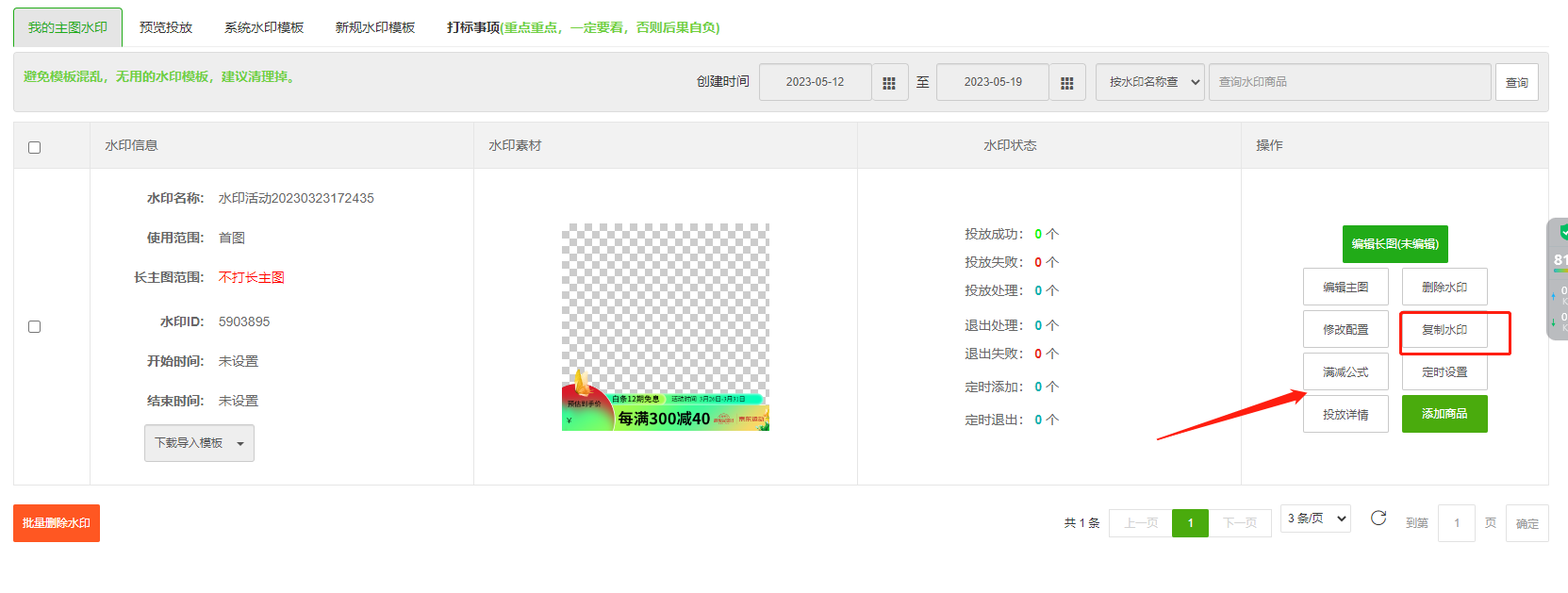 点击模版的复制水印,就是复制一个一模一样的水印任务,在页面上显示