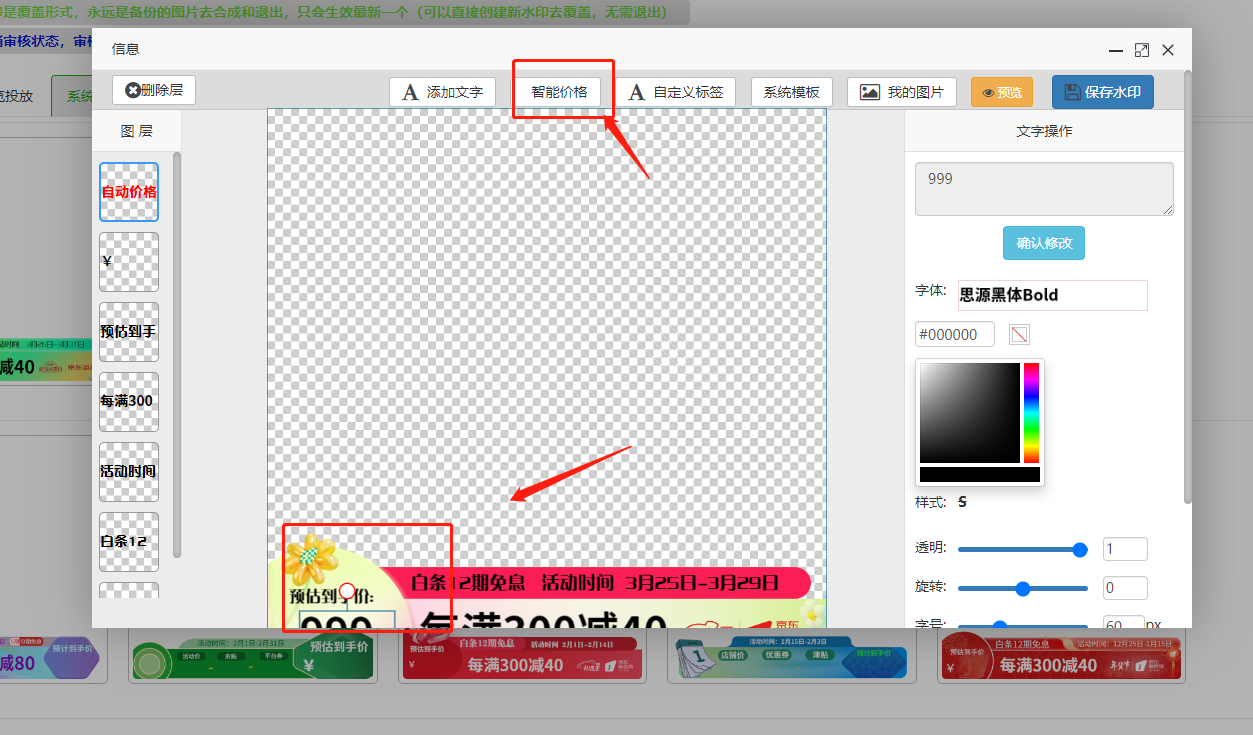 智能价格是默认在编辑器里展示为999,不可以更改,当合成水印后,自动匹配的商品页面上京东价价格