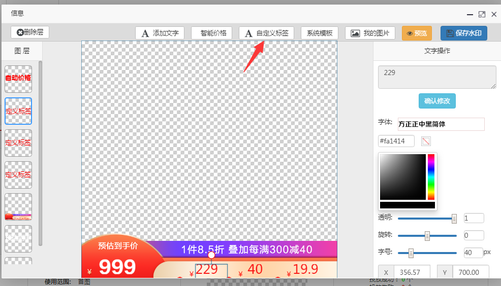 自定义标签是导入商品多种不同价格添加的标签名称,在编辑器模版添加自定义标签后,软件里下载导入模版,会匹配到自定义标签,在对应标签名称下方填写数字就是会在模版里合成显示。