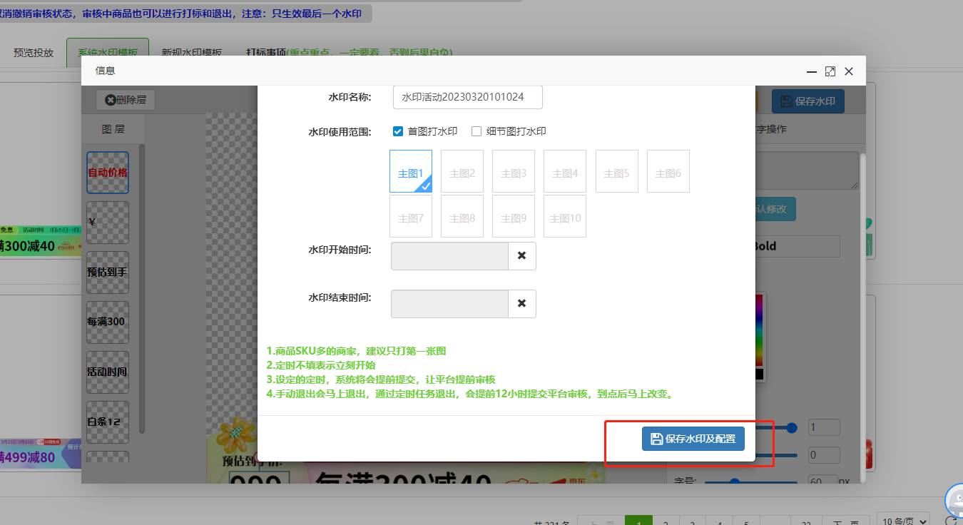 水印模版设置好后,点击保存水印,会弹出配置水印信息,可以填写水印名称,使用范围,水印开始投放时间,和水印自动结束时间。