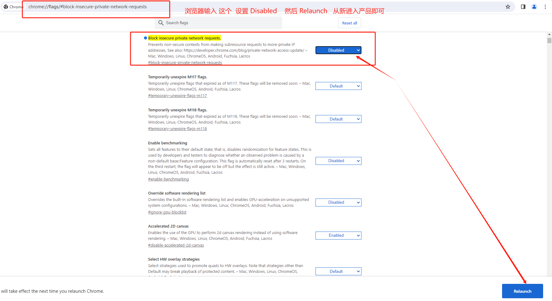 在GOOGLE 或360 浏览器输入:chrome://flags/#block-insecure-private-network-requests