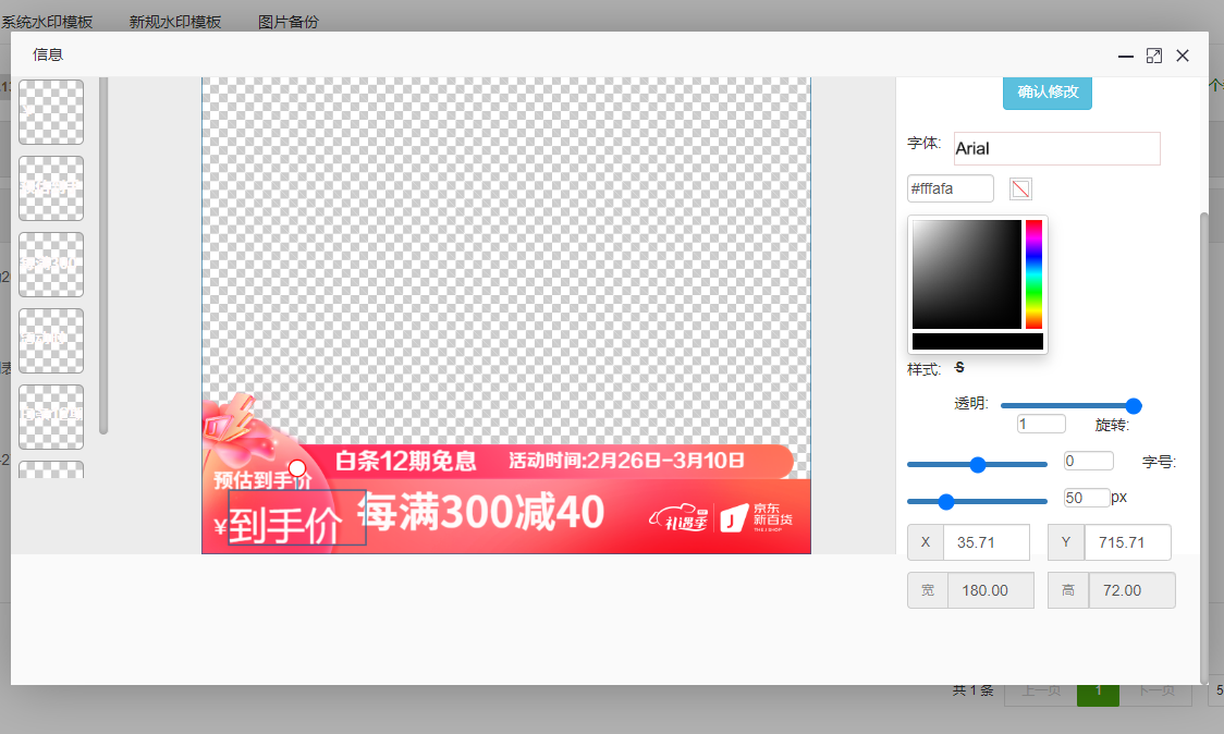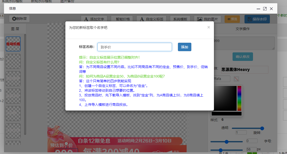 第一步,创建水印模板,或上传自己需要的水印,并自定义标签(不需要京东价的情况下) 如: 到手价