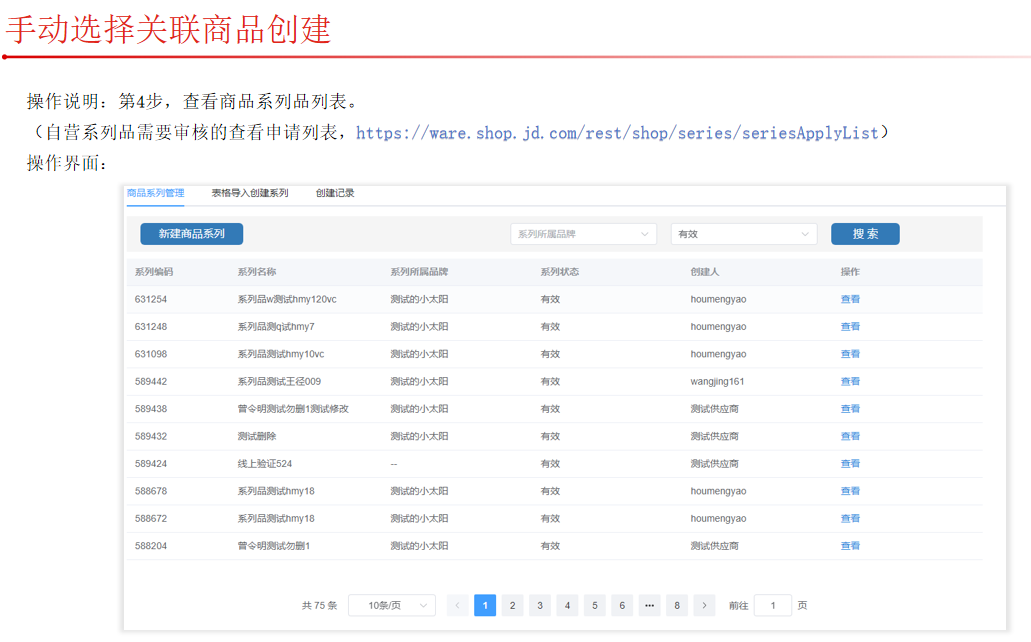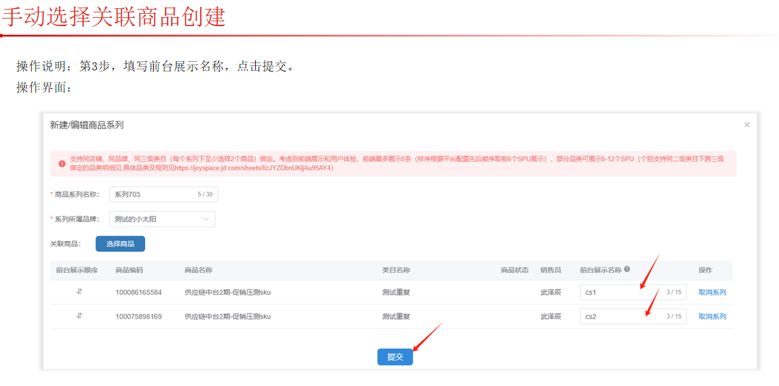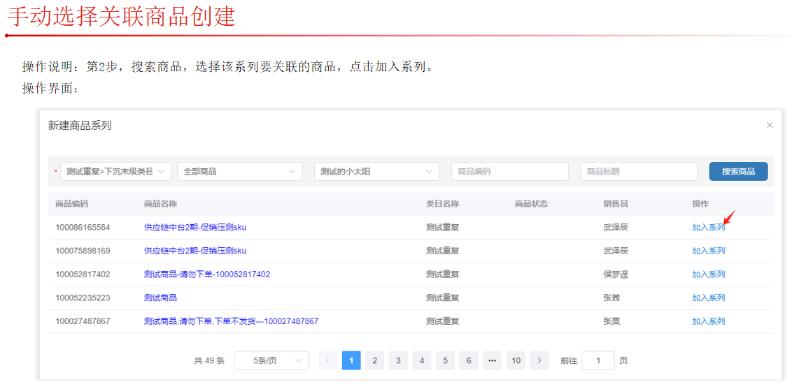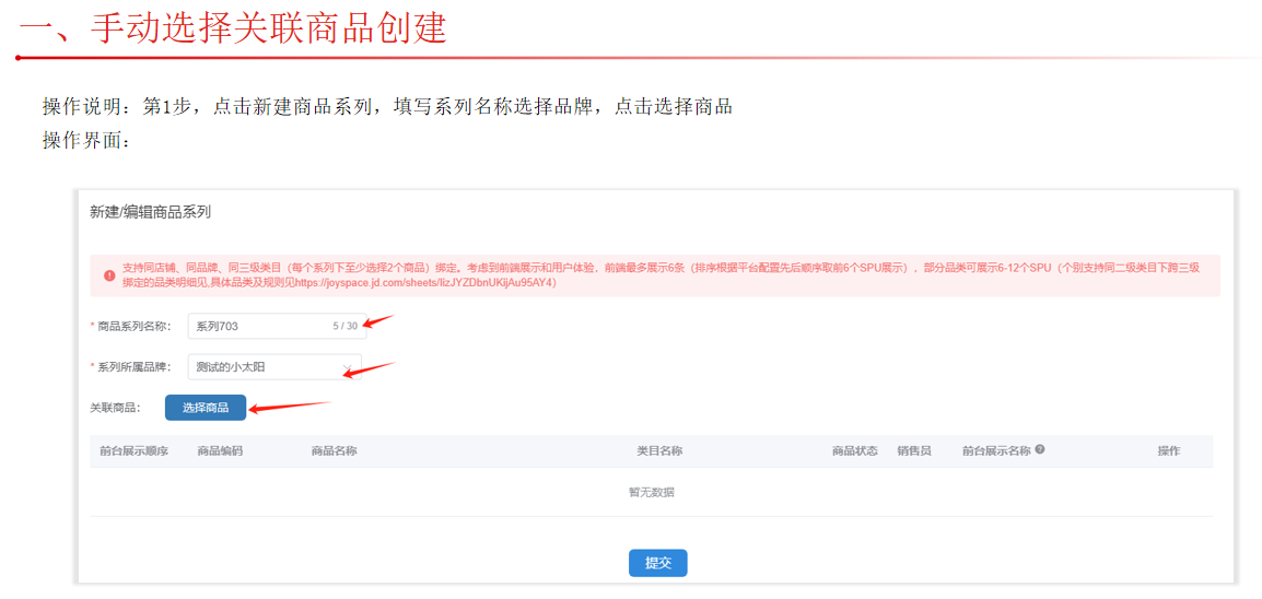 1、手动选择关联商品创建,按类目、品牌选定商品加入系列