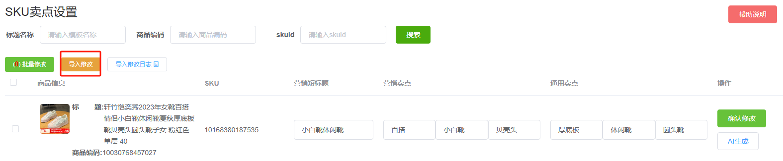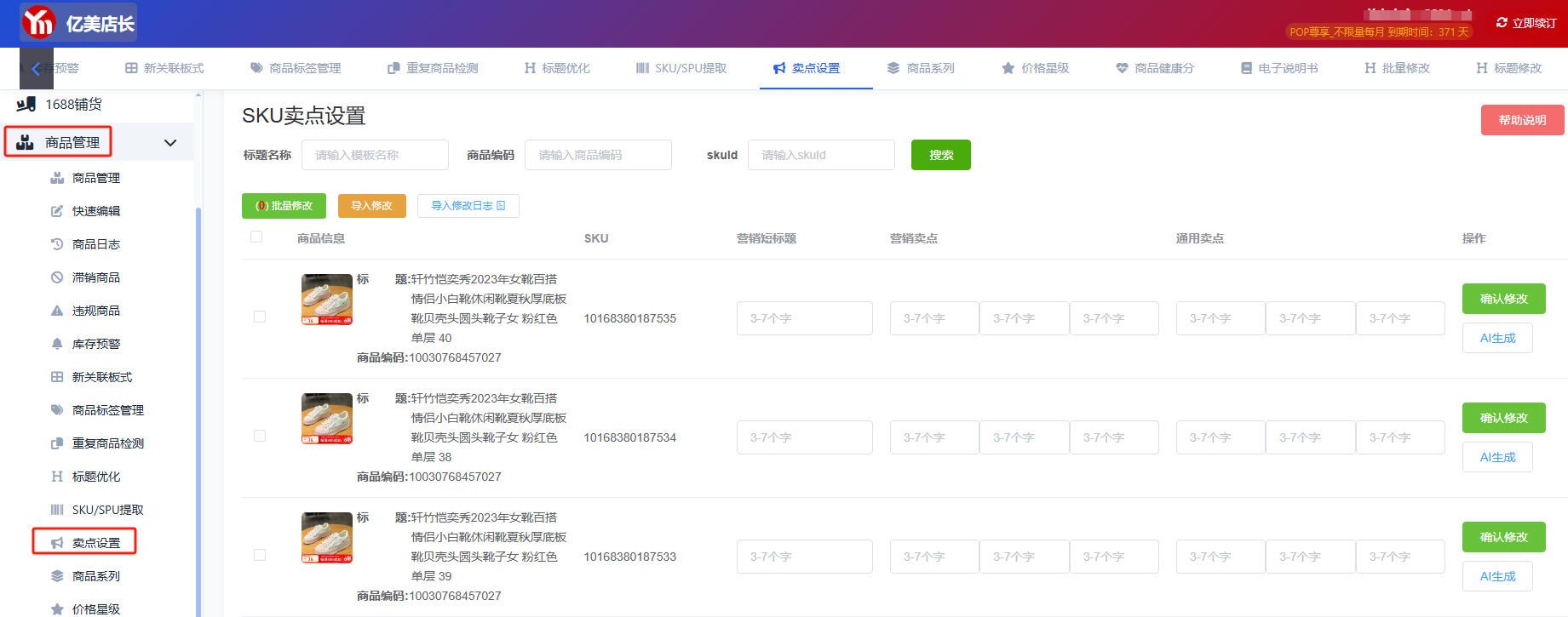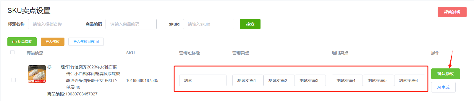 1、按sku修改,手动输入卖点,点击确认修改。