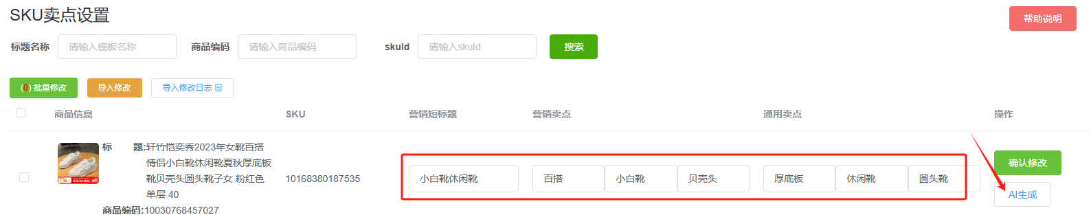 2、AI生成卖点,查看生成的卖点,点击确认修改。