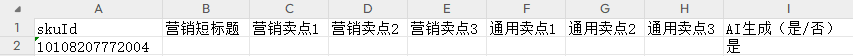填写sku编码、营销短标题、营销卖点1、营销卖点2、营销卖点3、通用卖点1、通用卖点2、通用卖点3、AI生成(是/否)