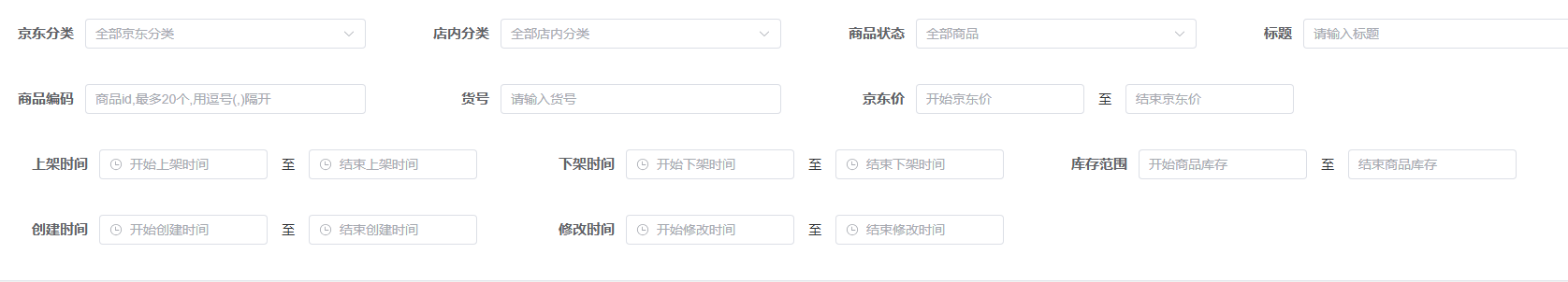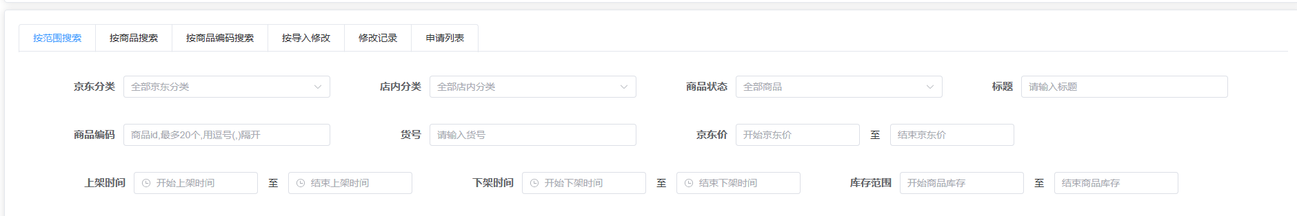 1、按范围修改,按京东分类、店内分类、商品状态、标题、商品编码、货号、京东价、上架时间、下架时间、库存范围、创建时间、修改时间