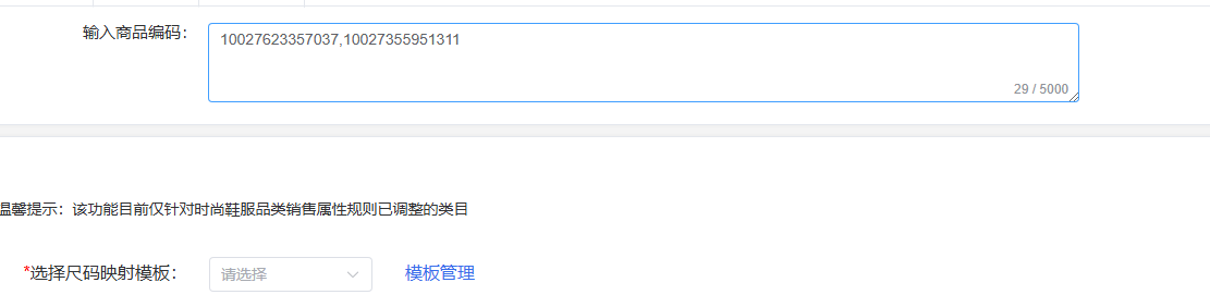 第1步,输入框内输入商品编码,一行一个,后续步骤同按范围修改尺码