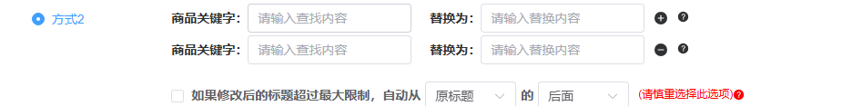 方式2:可以设置标题的关键词替换,系统会检测和您填写的关键词相关的标题,替换成其他的关键词,点击加号可以添加多个替换任务,减号就是删除替换任务。