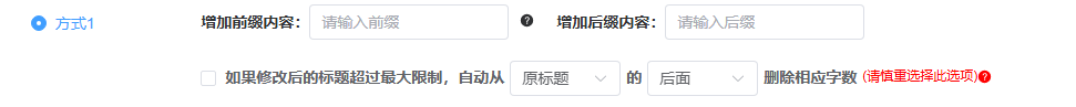 方式1:在原有标题基础上,给一个或者多个商品在标题前面以及后面批量添加关键词,因为平台对于标题有60个字符的限制(特殊类目除外),所以需要勾选如果修改后的标题超出50个字,您希望从哪删除掉字数来腾出空间。