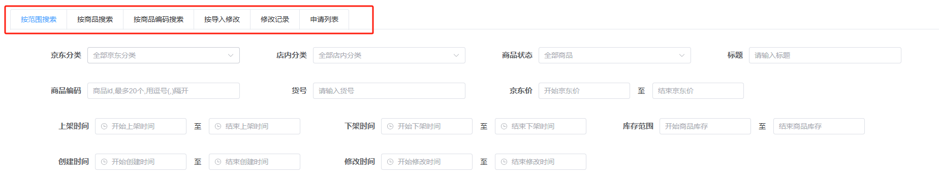 按范围修改:这个适合大量并且统一的商品,比如全店商品修改,或者选择京东分类里面其中的某个或者某几个的类目商品,或者标题带有某个或者多个关键词的商品等等,十分方便;