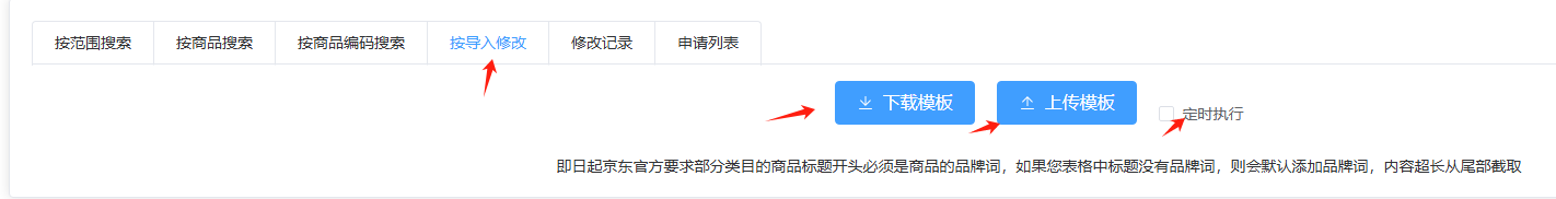 点击下载我们系统自带的表格模板,在表格中填写需要修改的商品编码(spu),并且分别对应填写新的标题,然后保存模板后,点击上传模板,选择这边模板导入进去,有定时执行任务需求的,可以勾选定时执行