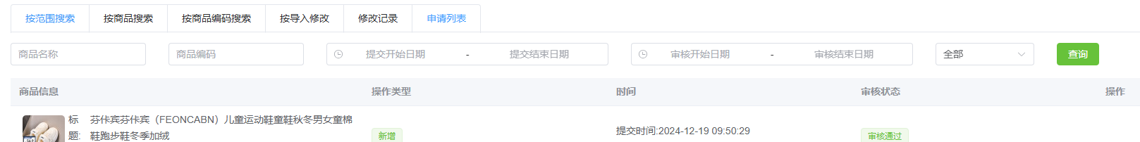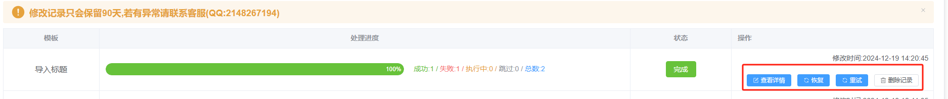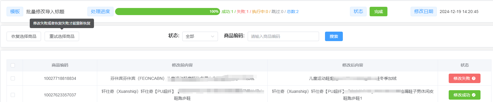 点击修改记录可查看修改进度和修改结果,点击查看详情可以查看具体修改的内容和审核是否通过及修改失败的原因(鼠标移动到对应商品的状态上既可查看失败原因或者审核状态),恢复可以恢复修改成功的商品,重试可以重试修改失败或者恢复失败的商品