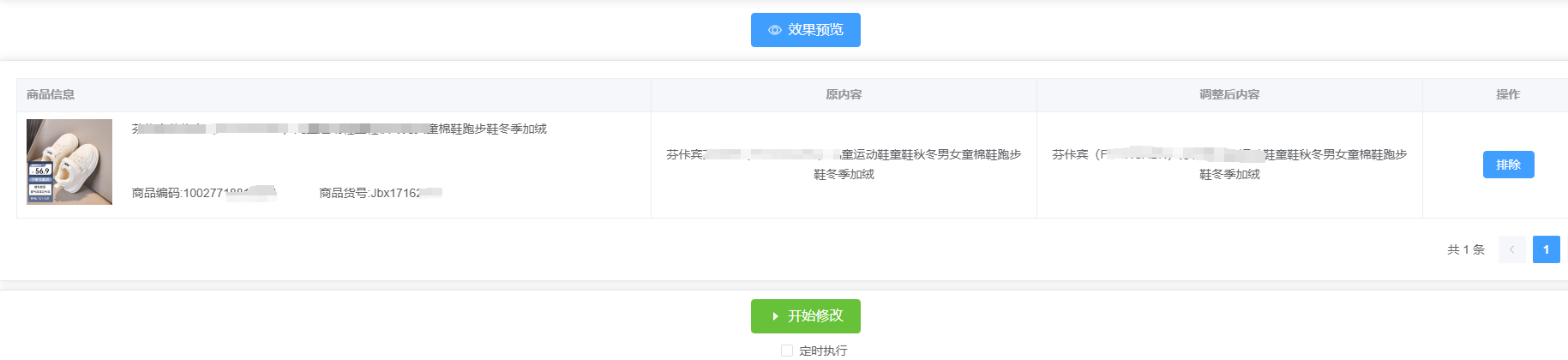 最后最后:商品选择了,修改方式也选择了,点击效果预览之后您可以看到调整前后的标题效果,确定没有问题后,可以点击开始修改,或勾选定时执行,定时投放。