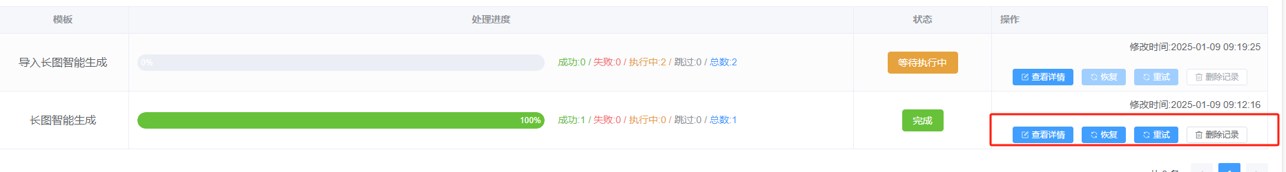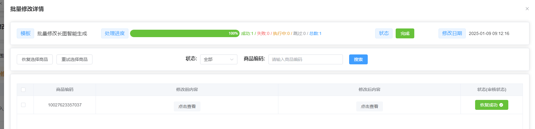 点击修改记录可查看修改进度和修改结果,点击查看详情可以查看具体修改的内容和审核是否通过及修改失败的原因(鼠标移动到对应商品的状态上既可查看失败原因或者审核状态),恢复可以恢复修改成功的商品,重试可以重试修改失败或者恢复失败的商品