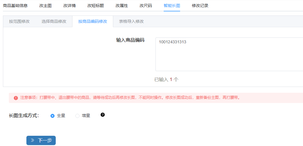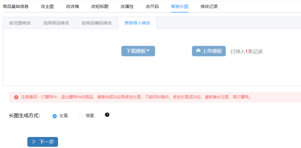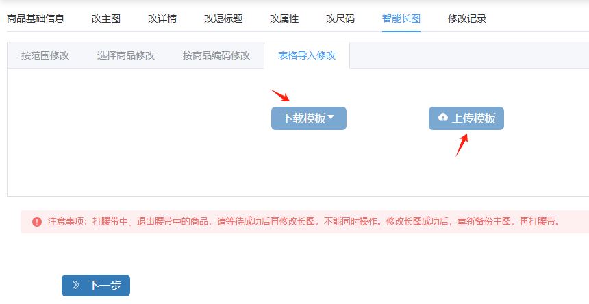 第1步,下载导入文件模板,填写商品编码,上传模板文件,点击下一步