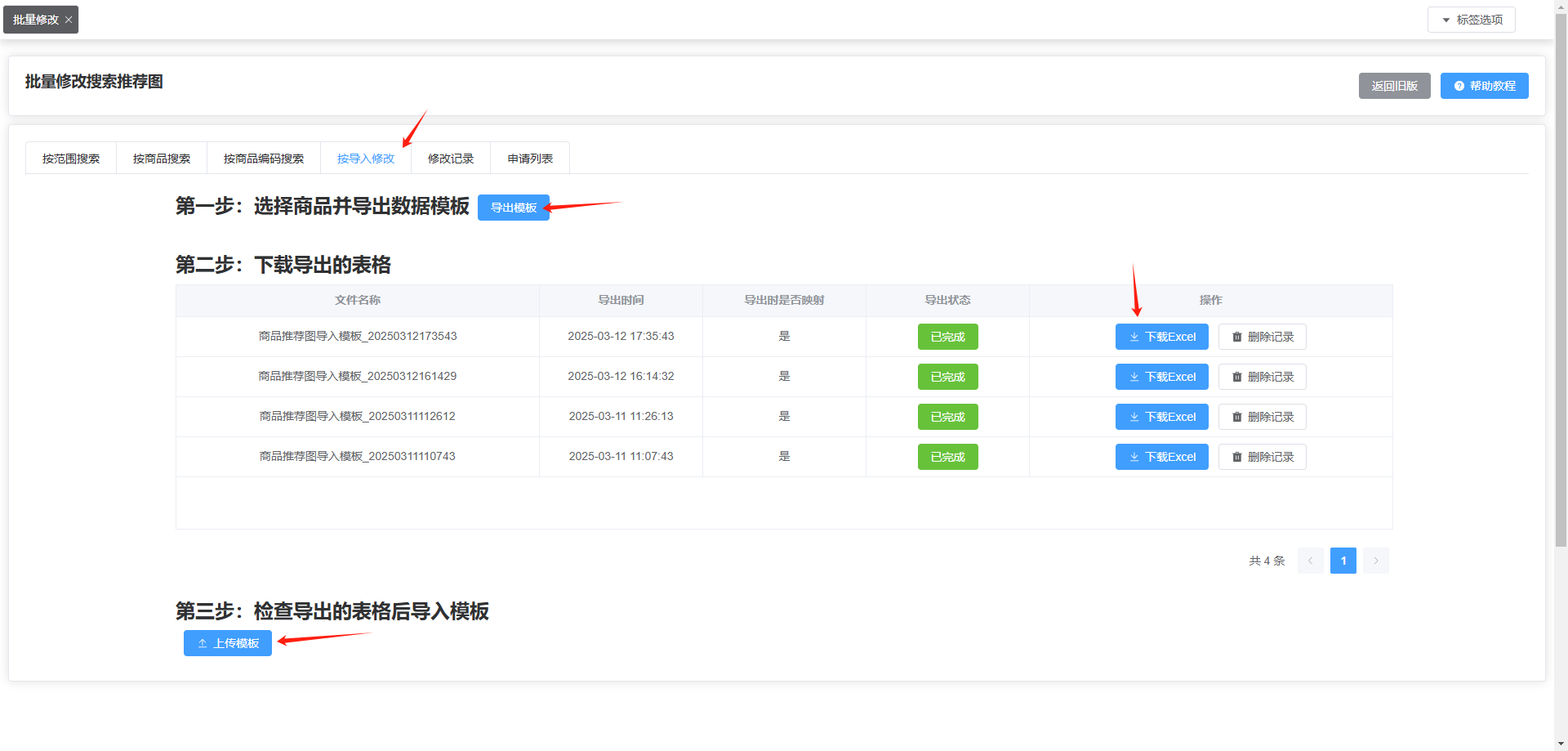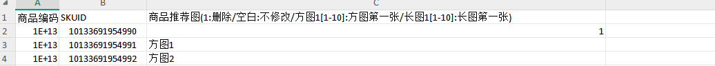 点击下载导出模板,可选择需要导出的商品。导出成功后点击下载execl,只需要在对于需要修改SKUID下填写。1:删除,不填写:不做处理,方图1[1-10]:方图第一张,长图1[1-10]:长图第一张)