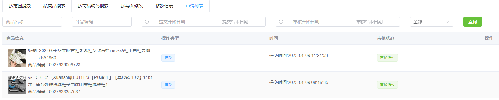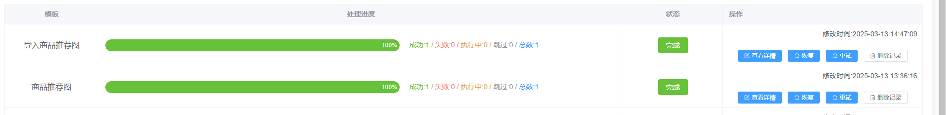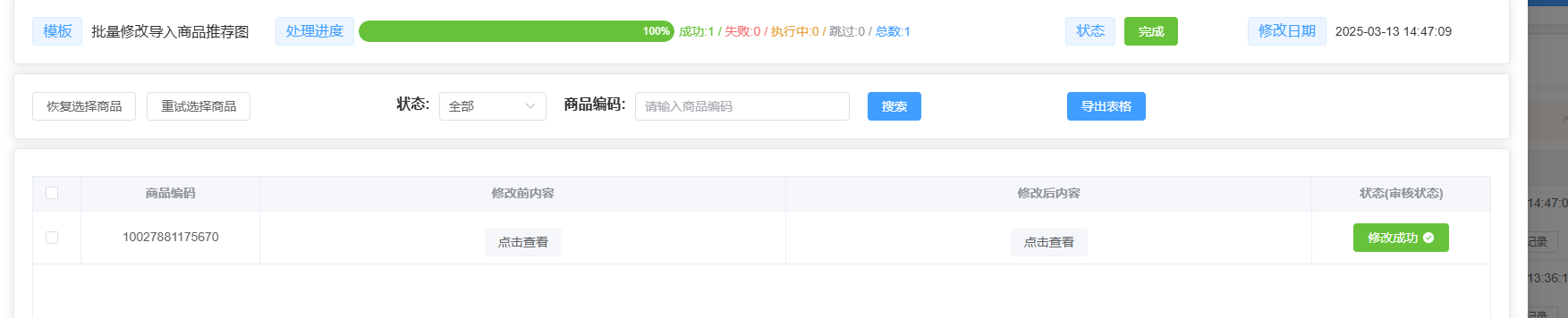 点击修改记录可查看修改进度和修改结果,点击查看详情可以查看具体修改的内容和审核是否通过及修改失败的原因(鼠标移动到对应商品的状态上既可查看失败原因或者审核状态),恢复可以恢复修改成功的商品,重试可以重试修改失败或者恢复失败的商品