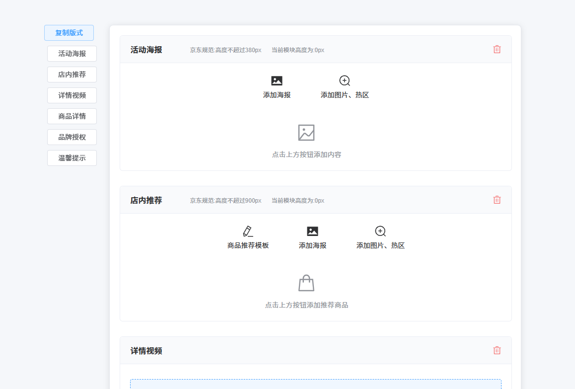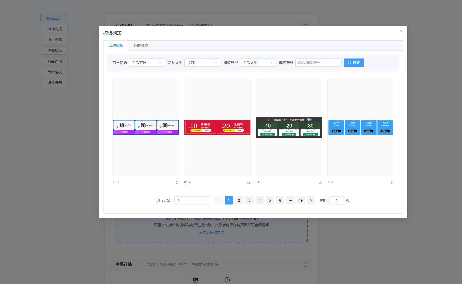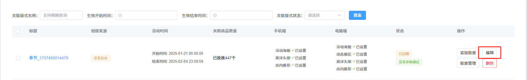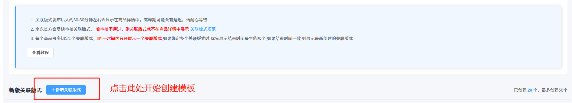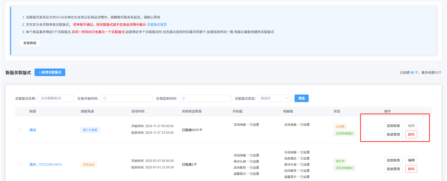 进入"新关联版式"页面后,所有创建过的关联版式都会展现出来(包括京东后台和第三方软件),您可以在这边进行该模板的修改,绑定商品等操作