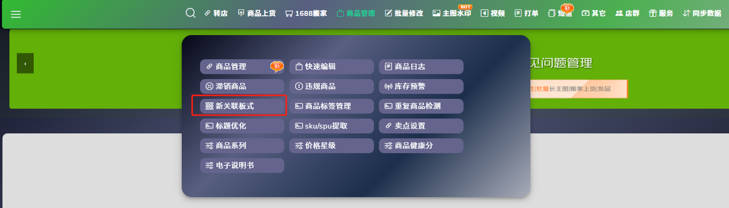 进入亿美店长首页,点击"商品管理"模块,选择"新关联版式"。