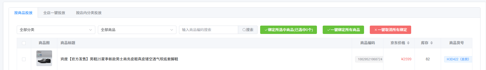 来到投放页面,选择商品进行绑定(也可以进行全店绑定和店内分类绑定)