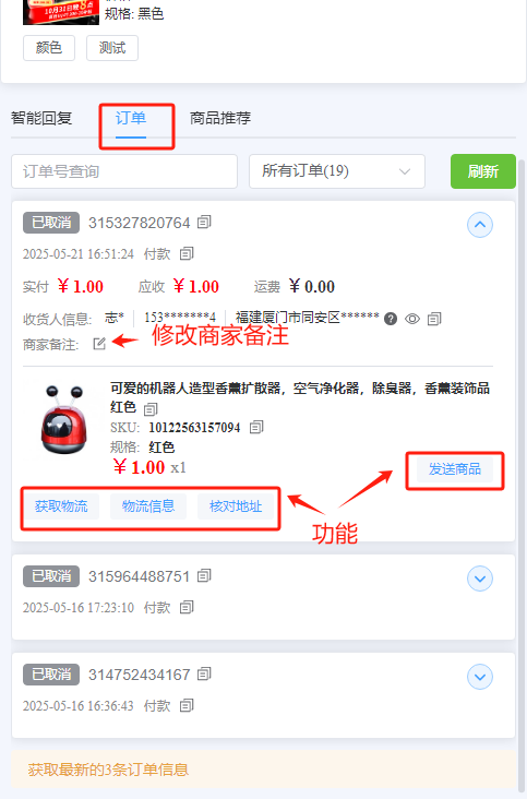 2.功能:点击获取物流后,获取物流信息可发送给用户,可查看该订单的物流信息,发送核对地址给用户