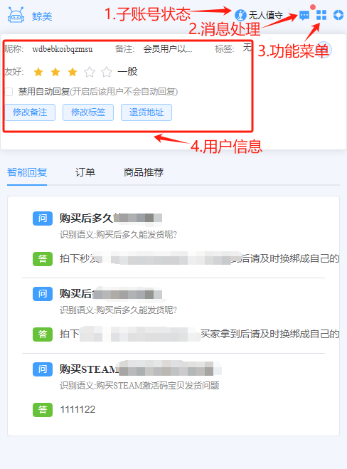 1.子账号状态:仅提示(机器人不做应答,在智能回复中可查看回复的内容),无人值守(机器人会根据知识库以及用户的配置进行回复),辅助应答(开发中...如果急需可联系客服)