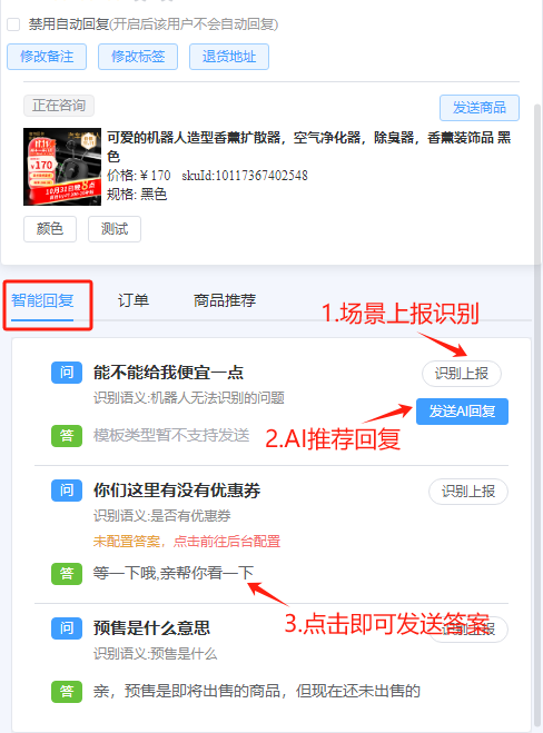 2.AI推荐回复:当机器人无法识别问题时,AI会根据训练的知识库进行推荐(AI识别会有偏差,发送前请确认)