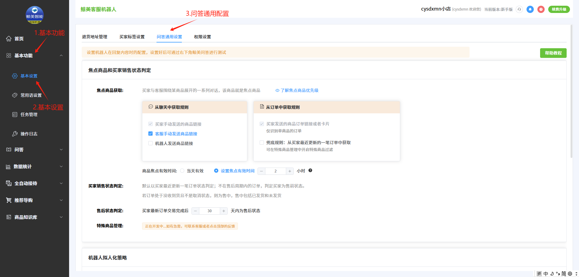 欢迎各位商家使用鲸美机器人,下面是基础设置中的问答通用配置