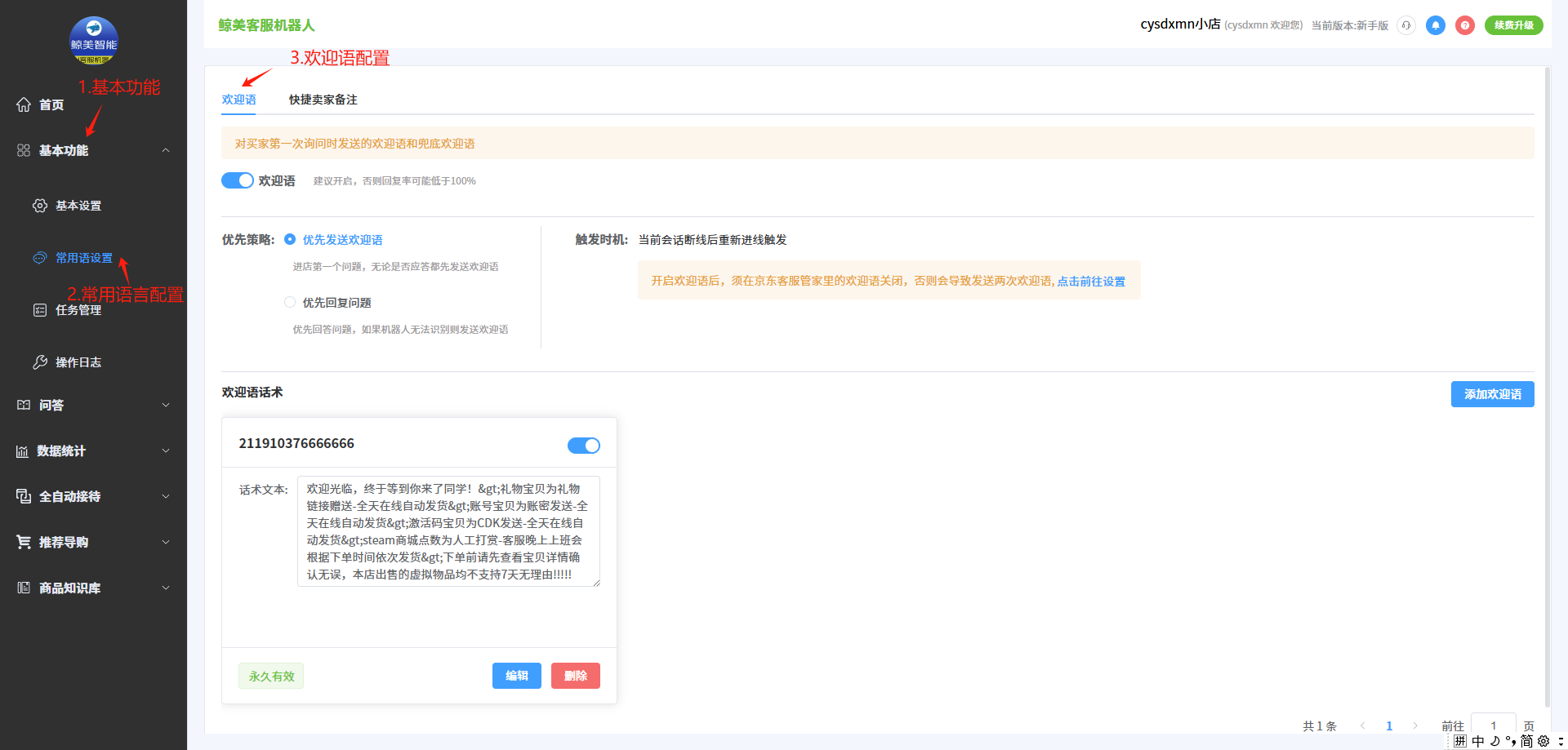 欢迎各位商家使用鲸美机器人,下面是常用语设置中的欢迎语