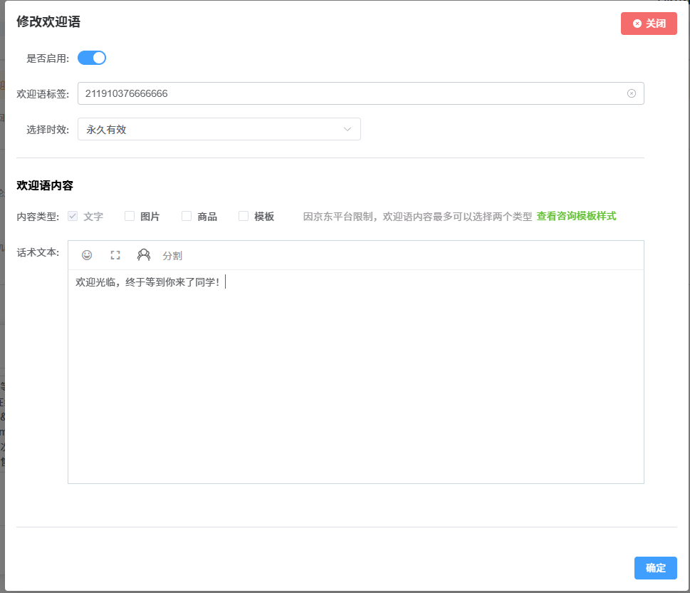 1.可根据发送欢迎语的需求设置时效