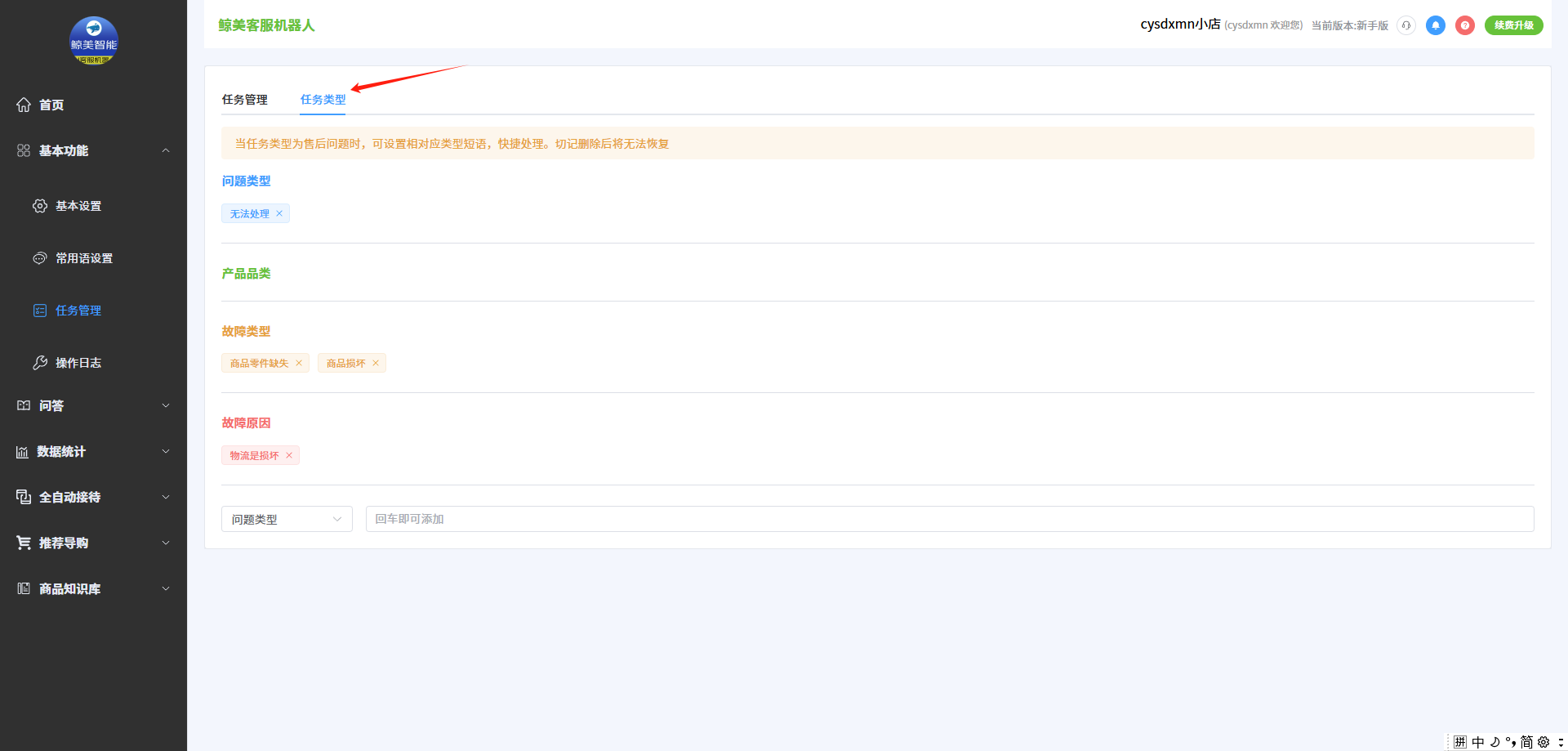 4.到任务类型这里可以添加快捷问题