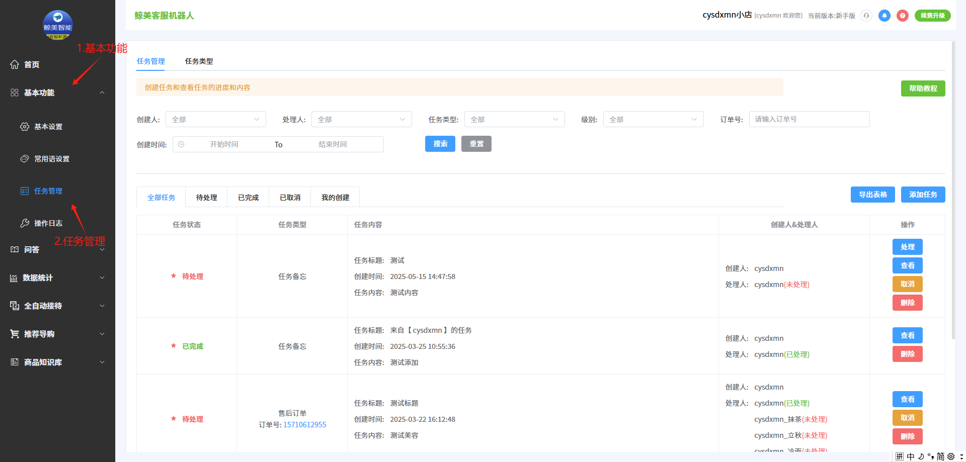 欢迎各位商家使用鲸美机器人,下面是常用语设置中的任务管理
