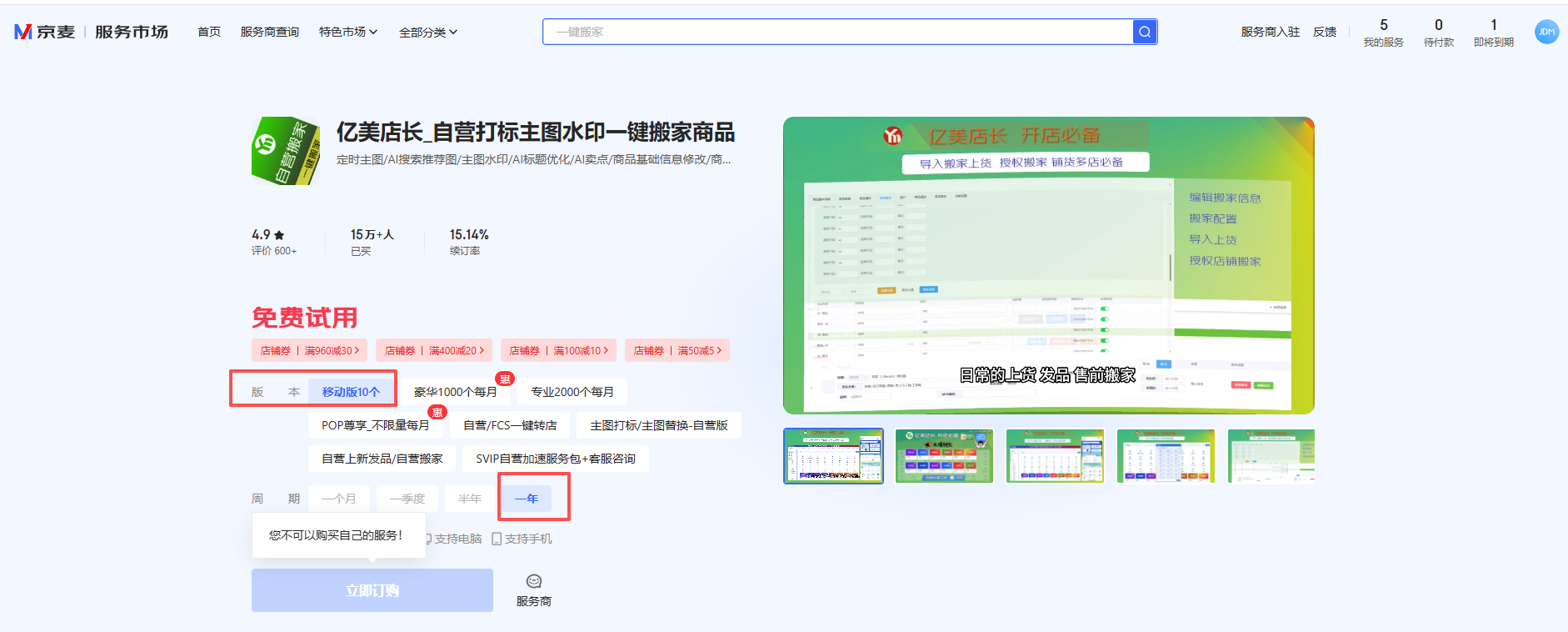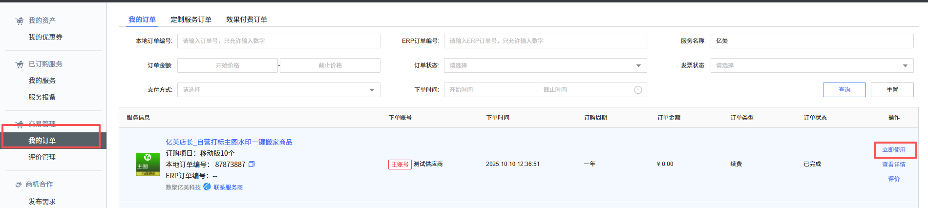 1).新账号订购亿美店长免费版本.并服务市场-我的订单-立即使用进行登录.