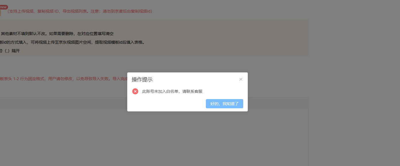 使用要求:如果页面提示未加入白名单,白名单申请链接:https://joyspace.jd.com/sheets/qgReQ70VvKt6JUCIQq8X 多主图视频白名单(自营就写自营的供应编码,是POP就写POP的商家ID)周五审核