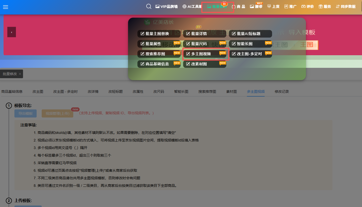 入口:点击导航栏头部的菜单 批量修改-->多主图视频
