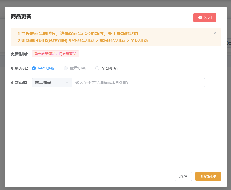 1.当使用全店投放和SKU维度导入投放必须更新商品