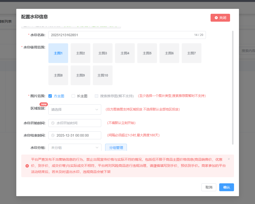 水印结束时间: 必填 必须大于水印开始时间1小时