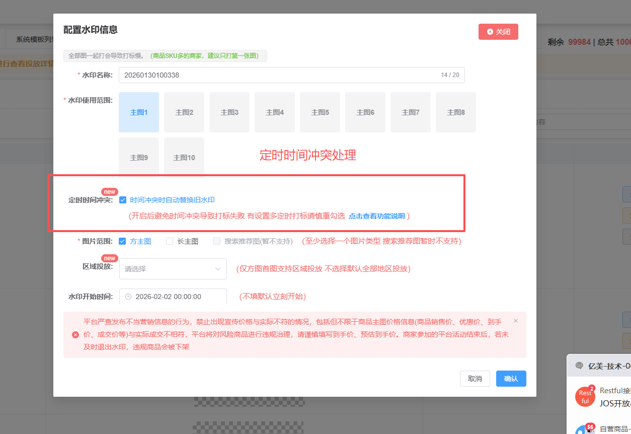 创建水印模板并保存时,系统将自动应用水印配置。默认开启「定时时间冲突时自动替换旧水印」选项。