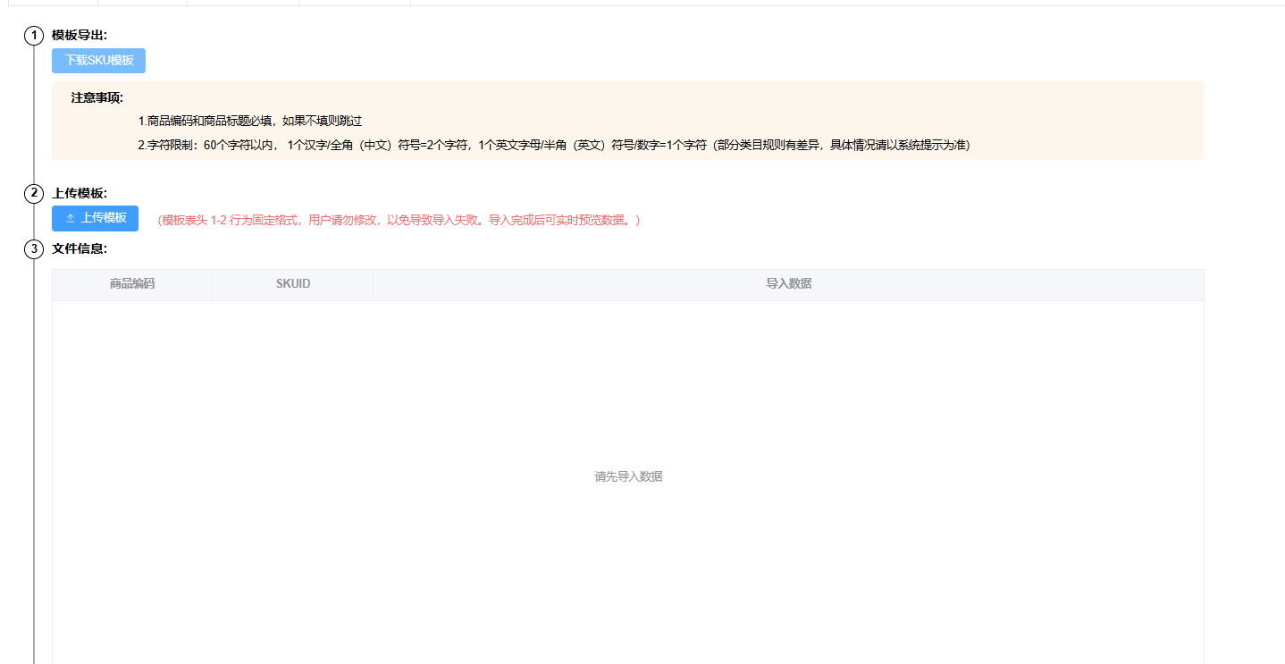 3.导入方式只需要填些SKUID,无需填些商品编码
